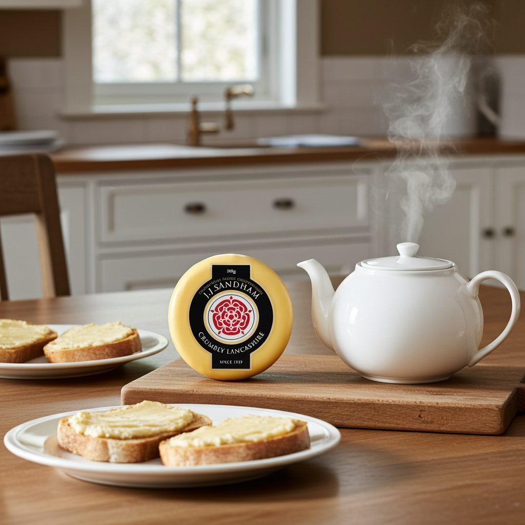 Crumbly Lancashire Cheese by JJ Sandham is a true celebration of traditional Lancashire cheesemaking. Crafted with generations of expertise, this authentic Crumbly Lancashire Cheese offers a fresh, tangy flavour and a delightfully light texture that melts in the mouth. Pale cream to white in colour, it has an open-cut surface and a moist, succulent consistency that makes it instantly recognisable as a classic Lancashire cheese.